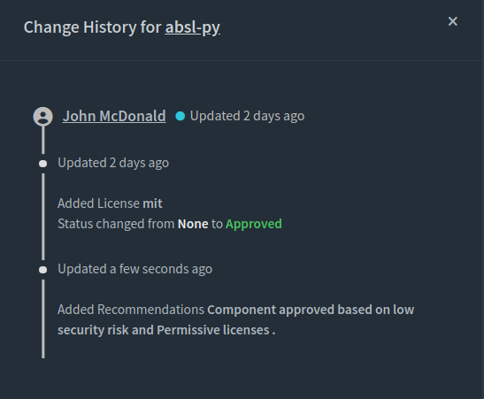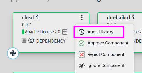 Audit history is helpful in determining the origin and timeline for changes made to artifacts. Changes to artifacts are automatically tracked by Threatrix platform and may be viewed by selecting Audit History from the 3 dot menu on the component card or menu.<br>